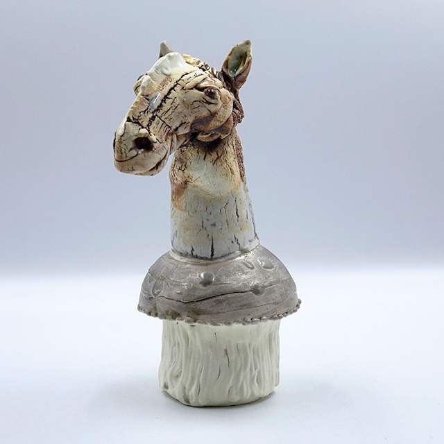 鴨頭みどりさんの作品は、幻想的でどこかノスタルジックな雰囲気のある魅力にあふれています。 施釉後に鉄釉をぬぐい取ることで、アンティークのような独特の質感と深みのある表情を醸し出しています。 ミステリアスな花飾りをまとった馬面です。 馬は来年の干支ですので、新年を迎える贈り物や縁起物としてもおすすめの一作です。 サイズ 約 H22cm × W17cm × D14cm ※写真は色等できるだけ作品と同じ色を心がけていますが 光の加減等で多少異なる場合がある事をご了承下さい。 ※気になる点などがございましたらお気軽にお問い合わせ下さい 鴨頭7