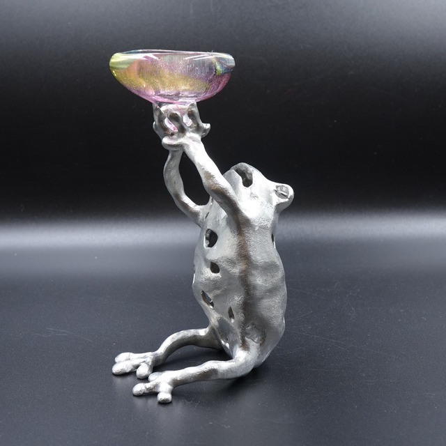 錫合金とガラスで作られた作品は細身さんならではの幻想的なかわいさに溢れています。 ジュエリーデザイナーのアシスタントで培ったデザイン・設計の技術とニューヨークで様々のデザイナーから受けた刺激を元に魅力ある自由な作品を作り出しています。 サイズ 約 H13cm × W12cm × D10cm プロフィール 細身博子 1967年7月27日生まれ。大阪出身。大学在学中から彫金を学ぶ。卒業後ジュエリーデザイナーのアシスタント を務め、ジュエリーデザイン・制作の経験を積む。デザインのみならず、すべて自身の手によって作品を作り上げる基礎は、この時代に培われた。また、同時に、宝石の意義、各々の石の持つ意味、古代の人々と宝飾品の関わり等を学び始める。 1989年、ニューヨークに渡る。当時のニューヨークのアートシーンは活気に溢れ、ジュエリー、アクセサリーの分野に於いても、若いデザイナー達が氾濫していた時期であった。彼らはその自由な発想で、デザインはもとより素材にまで個性を競い合っていた。 NYで彼女は多くのデザイナーと出会い刺激を受け、ジュエリーデザインというカテゴリーにこだわらず、より大胆に表現できるアクセサリーの制作に取り組み始める。 1993年、帰国後、アクセサリーブランド「Bamboo Magic」設立。オリジナルブランド展開を開始する。 以来、顧客対応の一点物のジュエリー制作、セレクトショップでのコスチューム・ジュエリーの小売り、有名百貨店に於ける期間コーナー展開、有名企業とのデザイン提携、写真家やグラフィックデザイナーとのコラボレート、個展の開催など意欲的な活動を続けている。個展の際には会場内のデイスプレイは勿論のこと、アクセサリーベースや大型什器、照明の製作に至るまですべて自らが手掛け、独自の世界を創り上げる。そのことに端を発して、オブジェ制作や空間の演出にも精力的に取り組み、有名ブランドのウインドウデイスプレイや飲食店などの商業施設などのオブジェ照明や装飾など多岐に渡って活躍している。近年では、野外アートイベントなどに参加し、現代アートの分野に挑戦し、その活躍の場は広がり続けている。 ※写真は色等できるだけ作品と同じ色を心がけていますが 光の加減等で多少異なる場合がある事をご了承下さい。 ※気になる点などがございましたらお気軽にお問い合わせ下さい 細見6