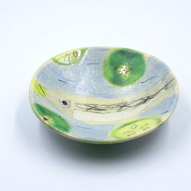 鮮やかな釉薬と布状の跡が特徴的な作品です。 美味しそうなおさかなとカボスのデザインは、食卓に爽やかさと彩りをもたらします。 手作業で施された布のテクスチャーは、土から生まれた器の温かみと柔らかさを感じさせる一方で、日々の食事に親しみやすいタッチを加えています。 その表面の繊細な模様は、光と影を捉えることで、多様な表情を見せてくれます。 可愛く楽しくも、実用的でありながら、どこか懐かしさを感じさせるこの作品は、日々の暮らしに優しさと楽しみを与えてくれます。 サイズ 約 H3cm × W14cm × D13cm 今井一美 プロフィール 1966 千葉県生まれ 1993 東京芸術大学大学院陶芸専攻科卒業 現在地に開窯 ※写真は色等できるだけ作品と同じ色を心がけていますが 光の加減等で多少異なる場合がある事をご了承下さい。 ※気になる点などがございましたらお気軽にお問い合わせ下さい 今井2-1