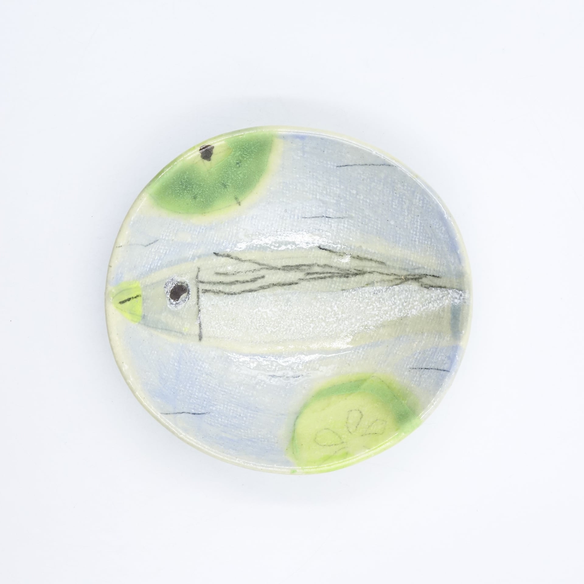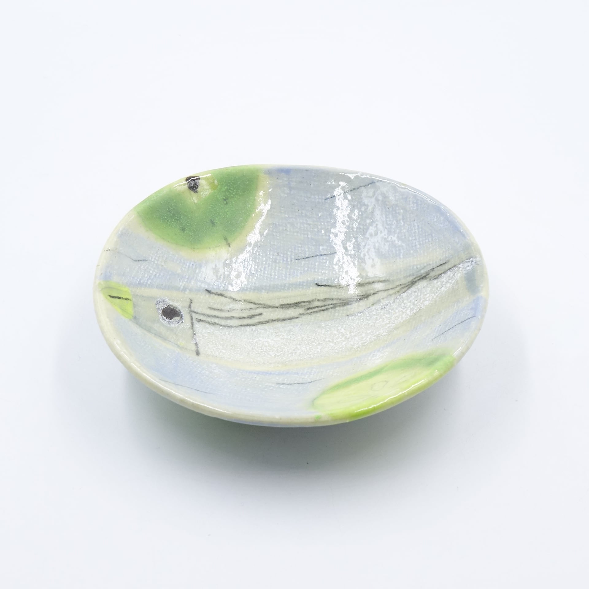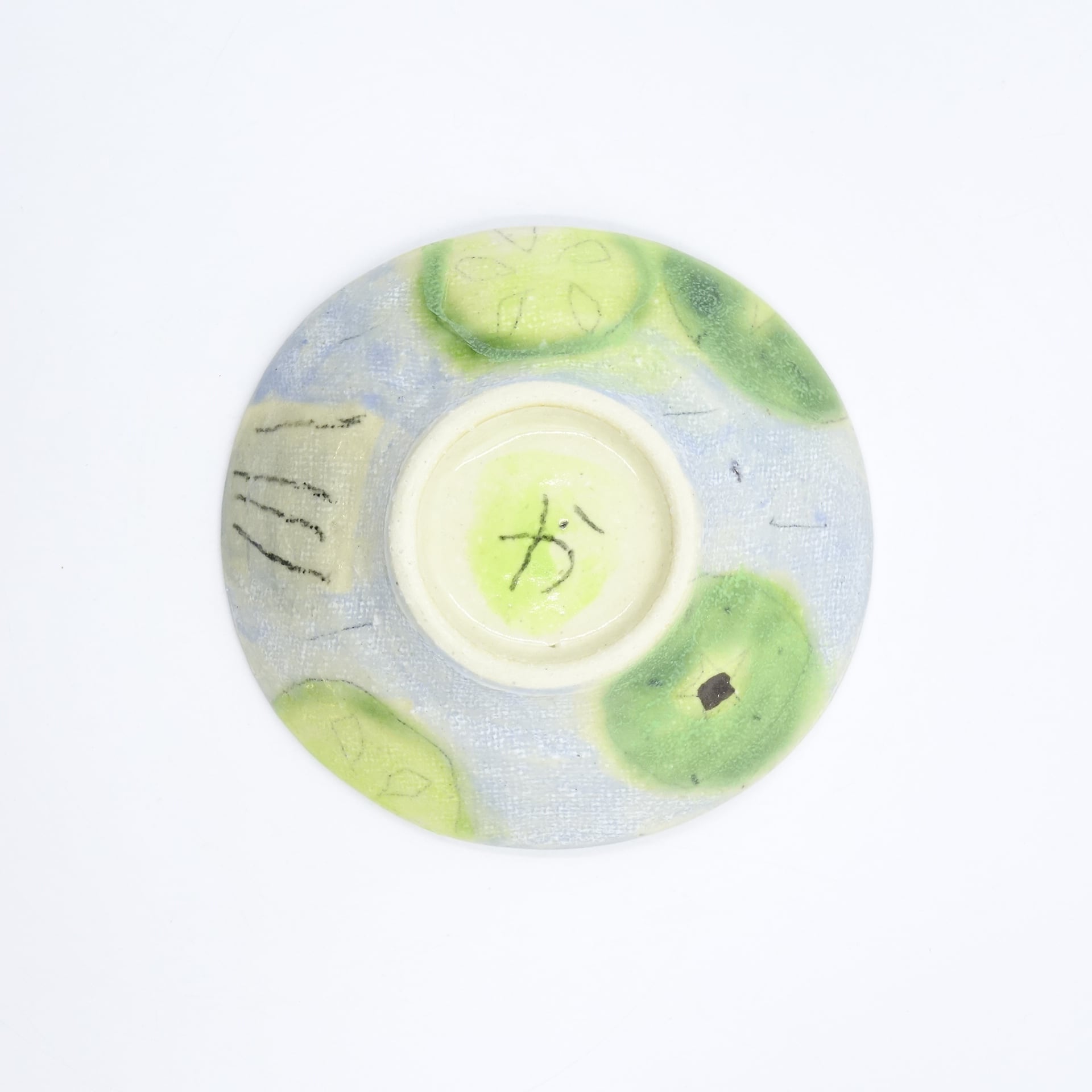 鮮やかな釉薬と布状の跡が特徴的な作品です。