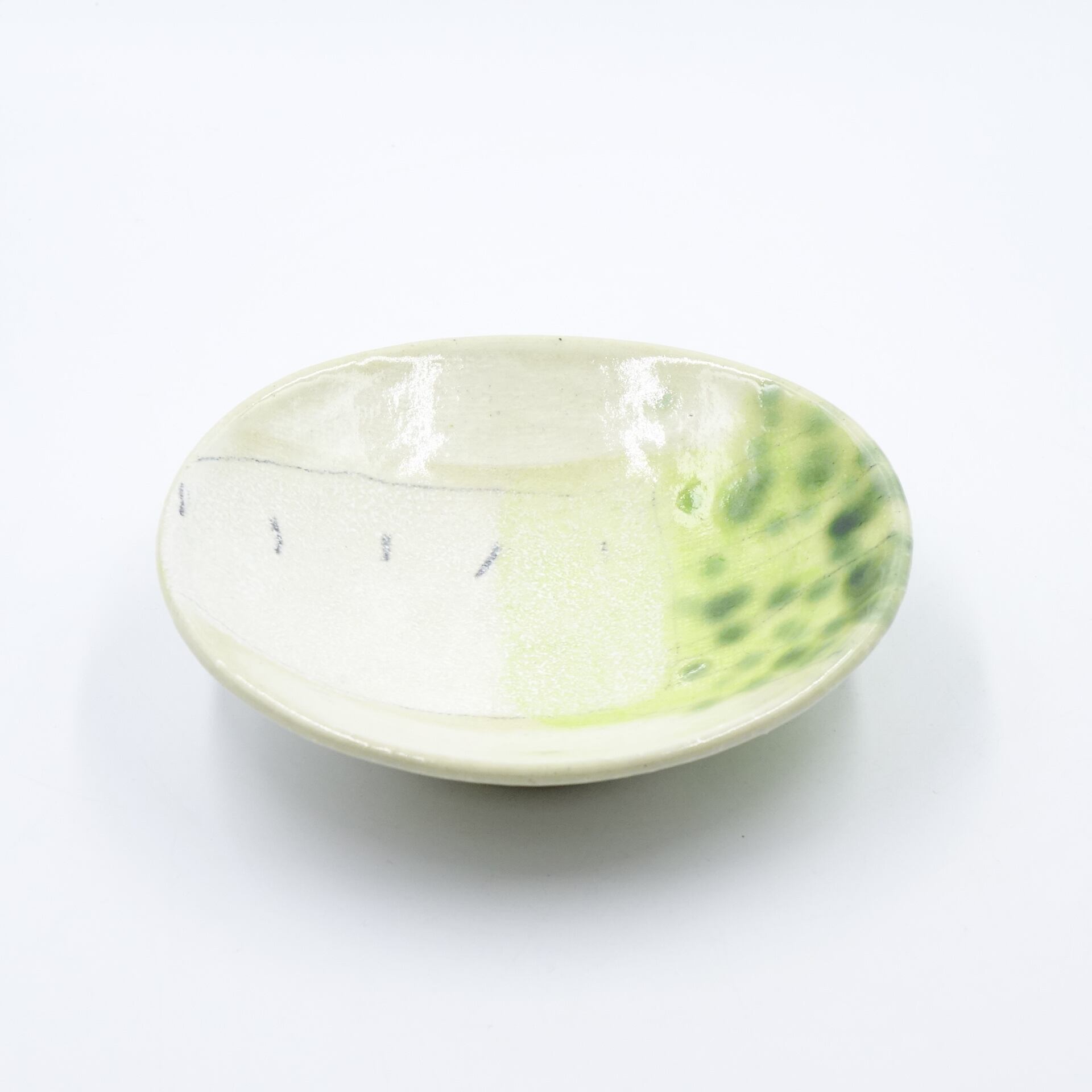 鮮やかな釉薬と布状の跡が特徴的な作品です。