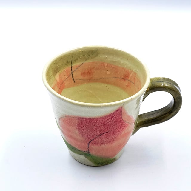 鮮やかな釉薬と布状の跡が特徴的な作品です。