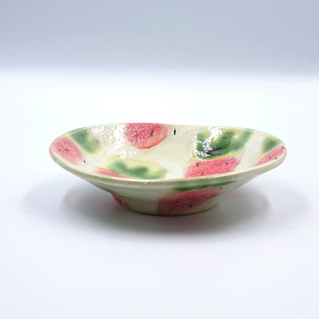 鮮やかな釉薬と布状の跡が特徴的な作品です。