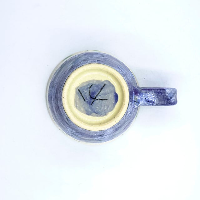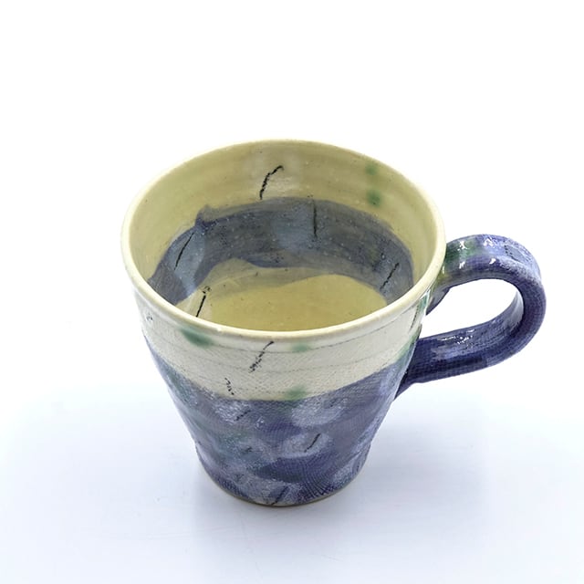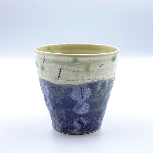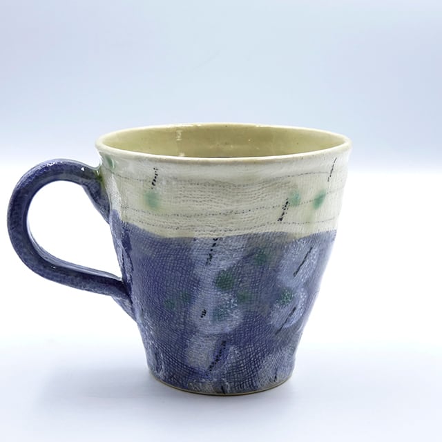 鮮やかな釉薬と布状の跡が特徴的な作品です。