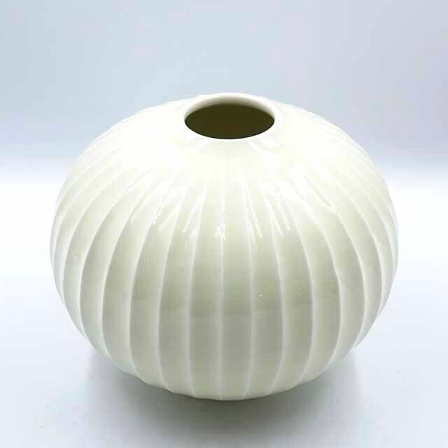 丸みを帯びた胴に縦の鎬が均等に刻まれ、光を受けるたびに柔らかな陰影が生まれます。どこから見ても美しいフォルムは、花を生けても、そのまま飾っても絵になる存在感。白磁の清らかな光沢とともに、空間にやさしい華やぎをもたらしてくれる一点です。