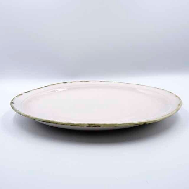 淡くピンクがかった白の釉肌が広々とした内面に広がり、口縁を縁取る緑がかった鉄錆色がさりげなく全体を引き締めています。シンプルでありながら手仕事ならではの温もりが感じられ、どんな料理も美しく盛り付けられる使い勝手のよい一枚です。日常の食卓はもちろん、おもてなしの席にもふさわしい大皿です。