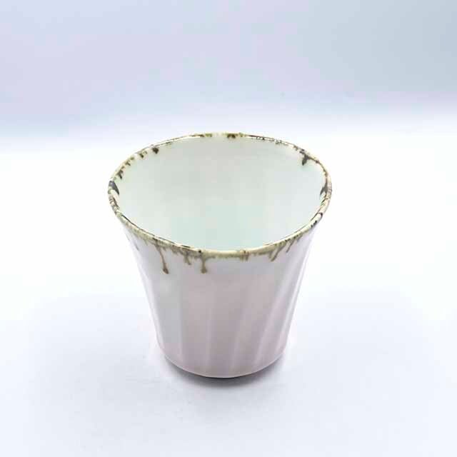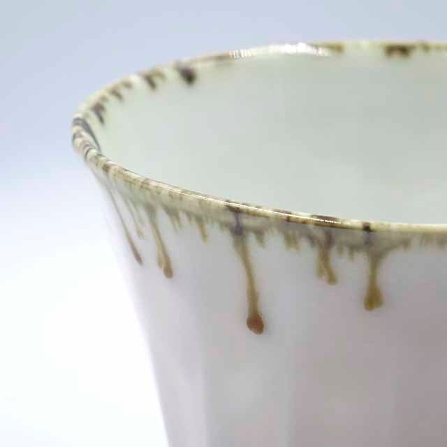 仄かな朱色を帯びた白の胴に、口縁から鉄錆色と灰釉が雫のように垂れ流れ、窯の中でしか生まれない生き生きとした景色を作り出しています。縦に走る面取りのラインが手にしっくりと馴染み、コーヒーや緑茶、お酒など様々な飲み物を美しく受け止めてくれます。日常の飲み物をちょっと特別にしてくれる、使い込むほどに愛着が増す一点です。