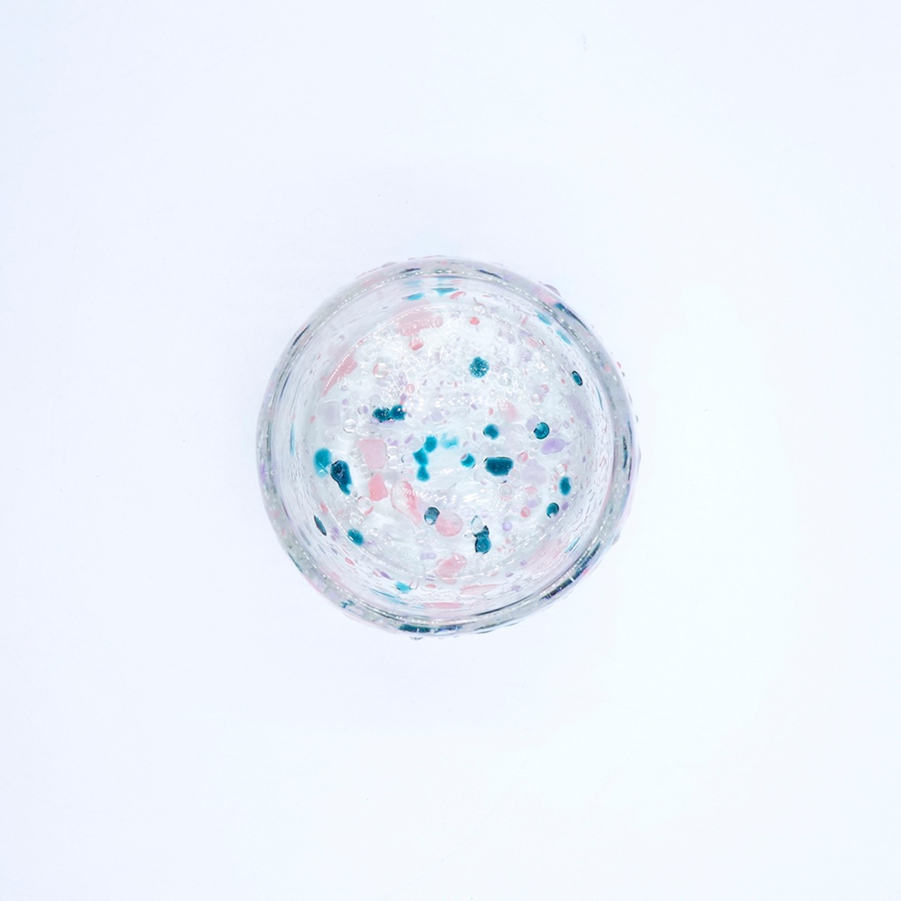 このガラス作品は、ぽっこりとした形状と微細な凹凸が織りなす、まるでお菓子のようなかわいらしさを放っています。