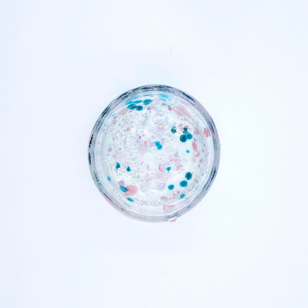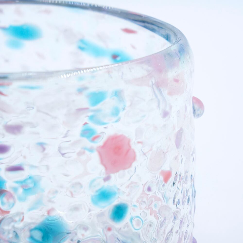 このガラス作品は、ぽっこりとした形状と微細な凹凸が織りなす、まるでお菓子のようなかわいらしさを放っています。