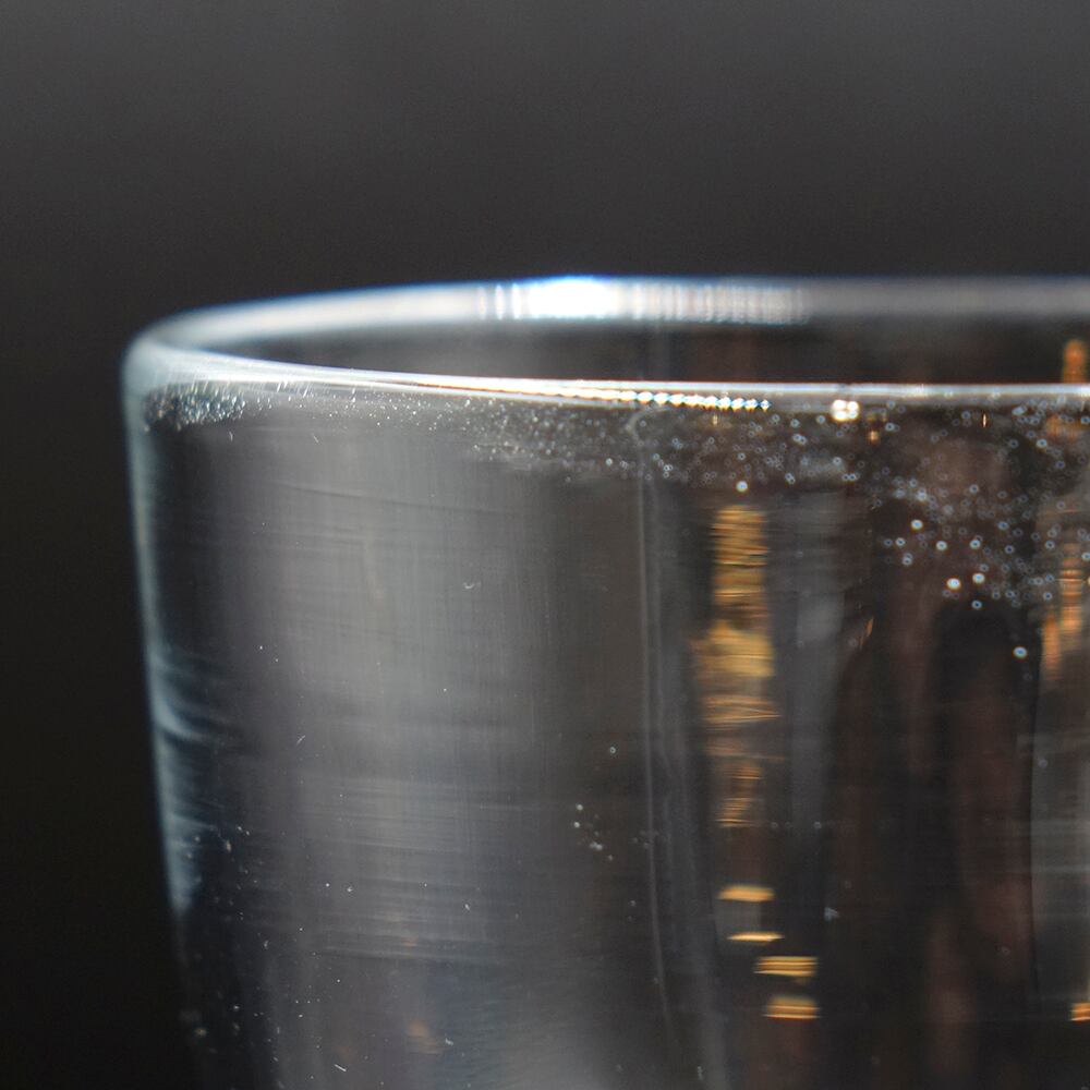 まっすぐに見えるラインにもわずかな曲がりをもたらし、手に持ったときの感触や口あたりのなめらかさを実現してくれ、不均一のガラスの厚みは、光に反射して美しい影を生み出します。