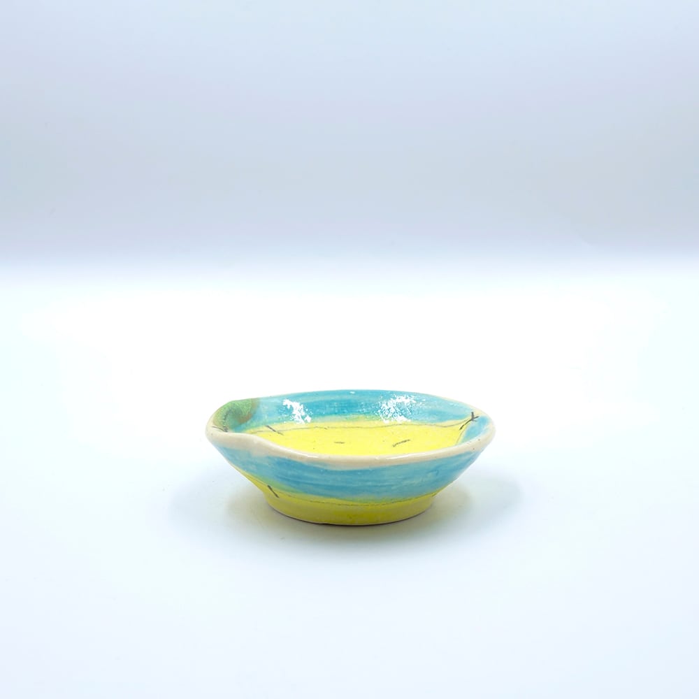 鮮やかな釉薬と布状の跡が特徴的な作品です。