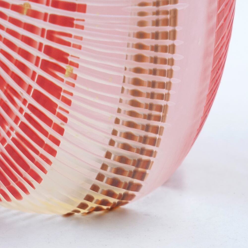 技法としては色ガラス作った後、カットを行いを幾重にも重ねつなぎ合わせ、吹くという繊細なバランスと高い技術を要求される作品です。