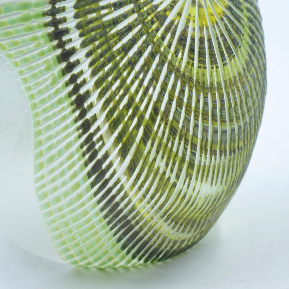 佐野曜子さんの織りシリーズは織物をイメージした細かく繊細なカットが不透明なガラスに爽やかな光を透過し美しい存在感を出しています。